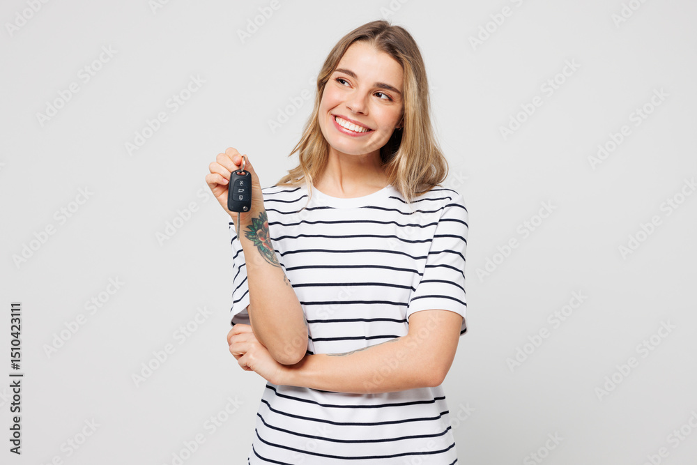 Young happy smiling woman she wear striped t-shirt casual clothes hold car key fob keyless system look aside on blank area isolated on plain solid white background studio portrait. Lifestyle concept.