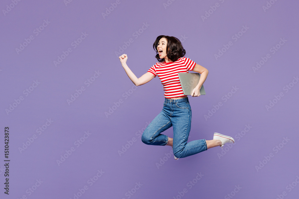 Full body young IT woman she wear red striped t-shirt casual clothes jump high hold use work on laptop pc computer run fast isolated on plain pastel light purple background studio. Lifestyle concept.