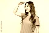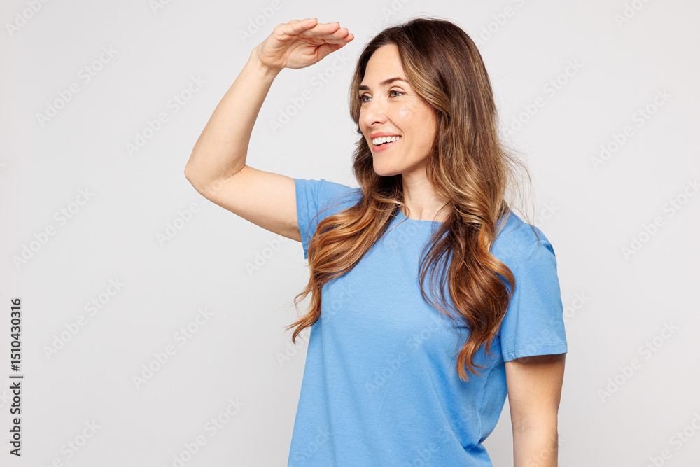 Side view young happy Caucasian woman wears blue t-shirt casual clothes hold hand at forehead look far away distance isolated on plain solid white color background studio portrait. Lifestyle concept.