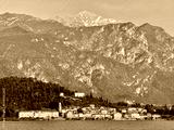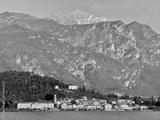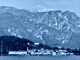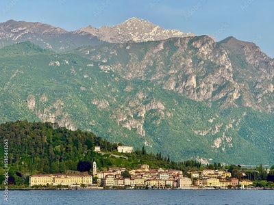 Scenic view from Griante and Cadenabbia villages on Lake Como shoreline with lush hills, alpine peaks and a ferry cruising on calm waters under a soft summer evening light