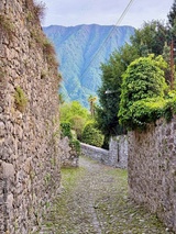 Old stone alleyways in Lenno and Ossuccio, Italy, featuring cobbled paths, rustic walls, olive trees and lush greenery, offering a peaceful atmosphere in a charming lakeside village