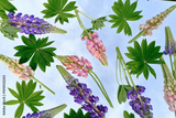 Flat lay of vibrant purple and pink lupine flowers and green leaves on a blue background. Fresh botanical pattern for nature-inspired designs and seasonal projects.
