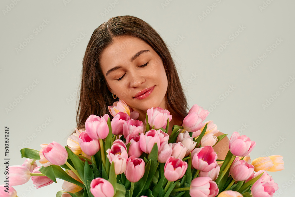 Beautiful woman enjoying bouquet of fresh pink tulips