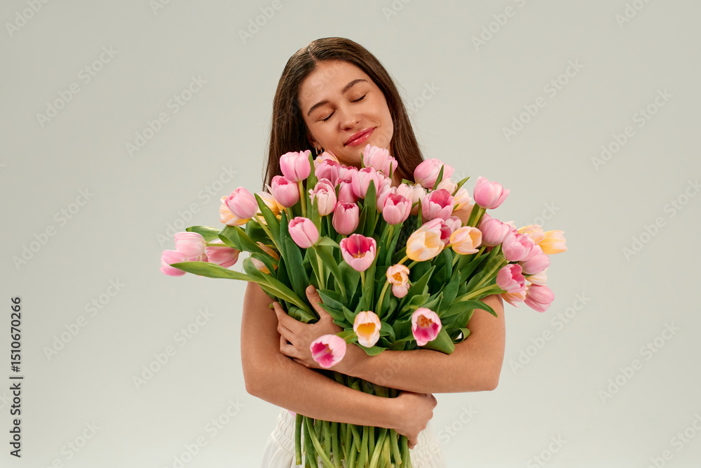 Smiling young woman hugging a big bouquet of pink tulips on neutral background