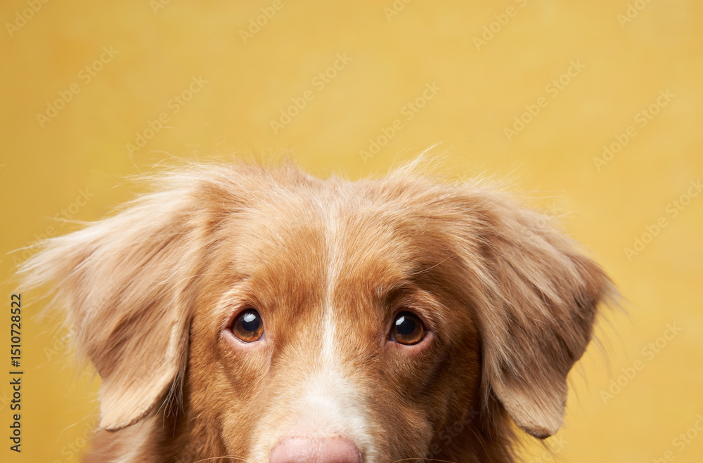 A retriever sits against a yellow background, gazing forward. The warm tones highlight its soft fur.