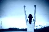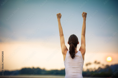 Strong and confident girl. Successful woman with her arms up in the air in celebration.