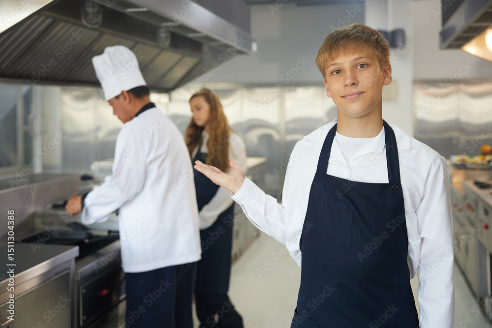 portrait young chef showing pose in the kitchen