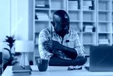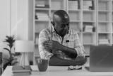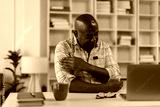 Senior retirement man is working with his laptop at home sitting his cozy workplace with a laptop computer business concept