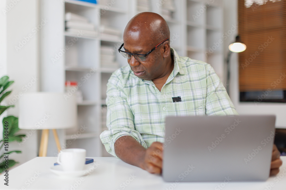 Senior man or old business man messaging with phone laptop sitting in room at workplace.