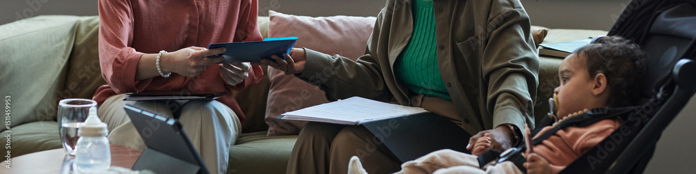 Header with women engaging in discussion holding tablet and notebook while sitting on couch with baby and documents visible on table nursing bottle in foreground
