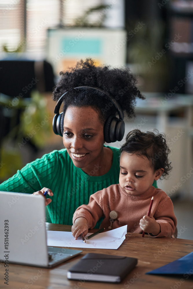 Smiling mother wearing headphones and using laptop while helping curious toddler with drawing. They are surrounded by plants and office supplies, creating a cozy and productive environment