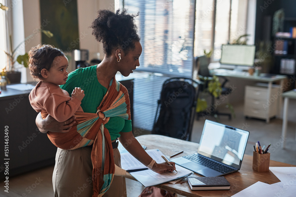 Mother working from home while holding baby in an office setting with a laptop and desk visible. Mother multitasking and demonstrating work-life balance in a professional environment
