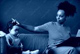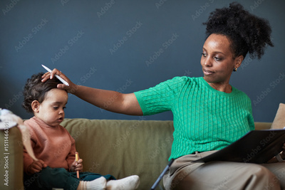 African American mother in green sweater sitting on sofa using tablet interacting with child who is holding a stuffed toy
