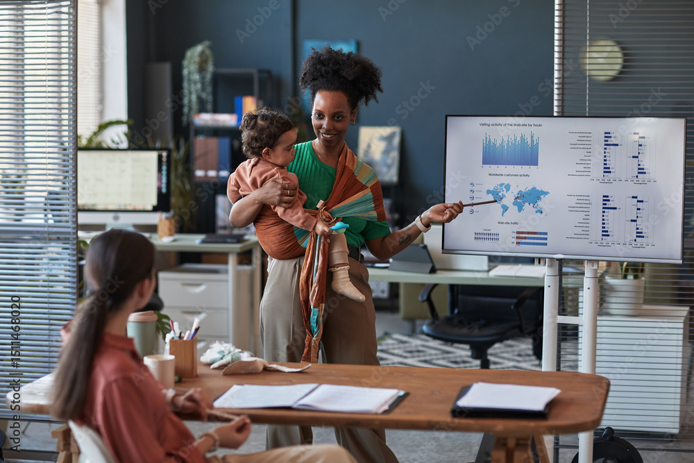 Working mother presenting important data while holding baby in office setting, showcasing multitasking and occupational dedication to team discussion