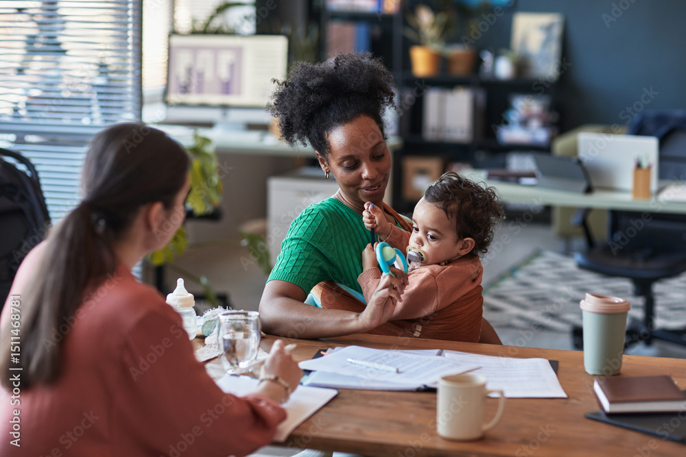 Multiracial mother in office holding her baby while discussing work with colleague. Papers, documents, and baby bottle visible on desk creating a busy atmosphere
