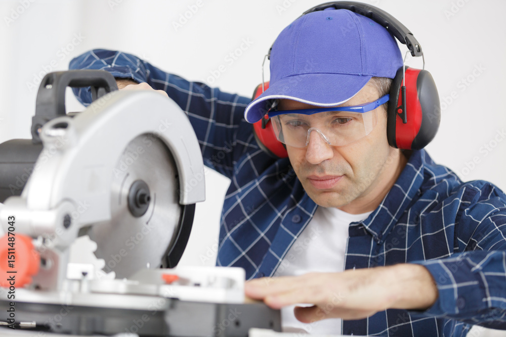 mature man using circular saw