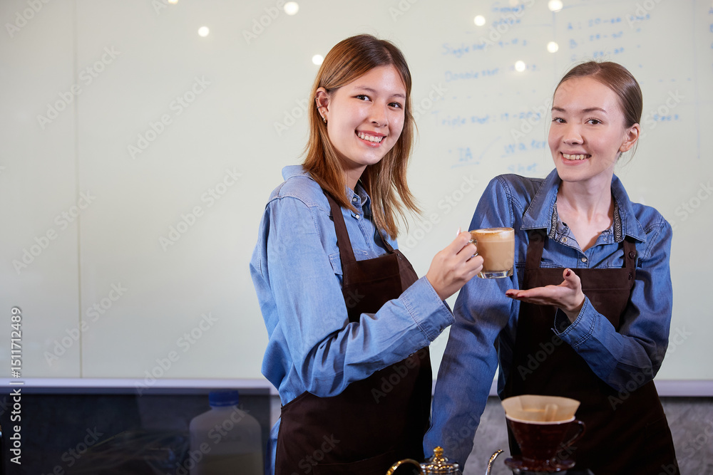 portrait young baristas women smiling and holding a cup coffee in the cafe