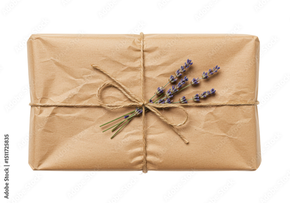 Isolated Brown Paper Wrapped Gift with Lavender