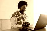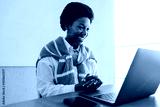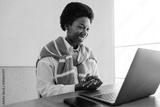 Professional black businesswoman sitting at a desk with laptop during an online meeting