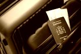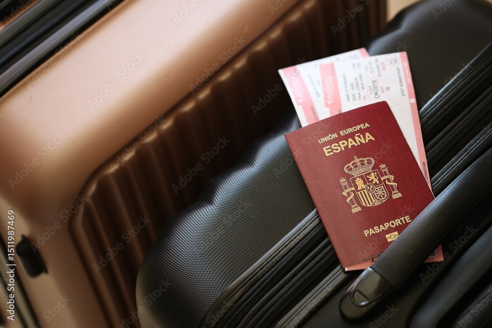 Spanish passport with tickets lies on touristic suitcase close up in airport waiting hall