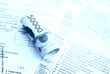 South Korean won money bills in big amount lies on table with tax forms close up