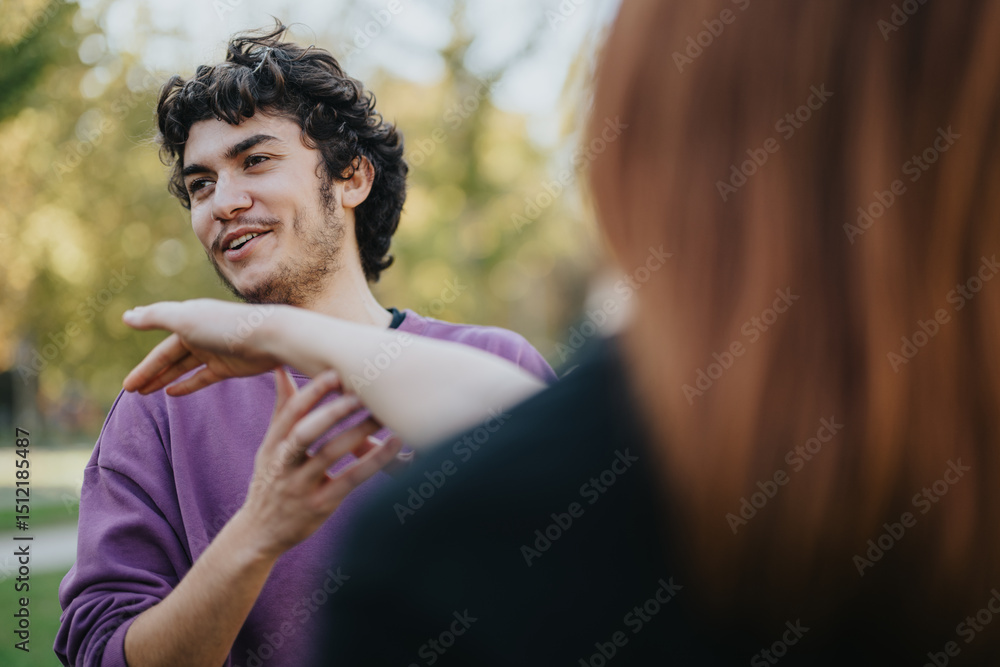 A cheerful couple engaging in a playful interaction outdoors in a park setting, enjoying a sunny day. Their expressions and gestures reflect joy and connection.