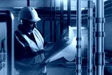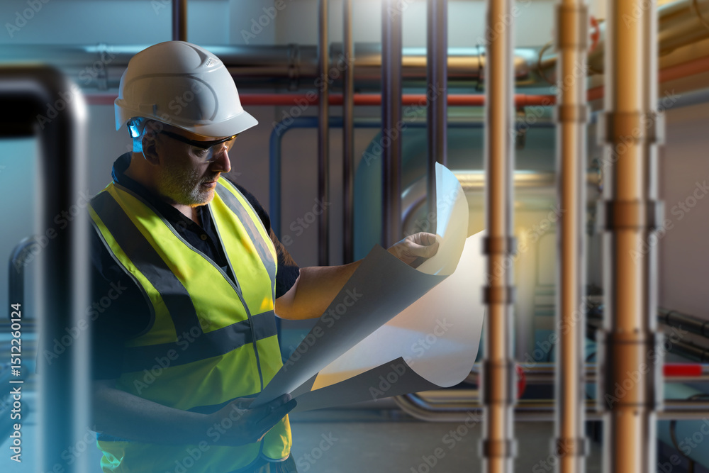 Engineer in safety gear checks blueprints in mechanical room filled with industrial pipes and systems. Activity: Engineering, industrial maintenance, mechanical systems.