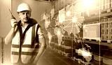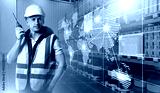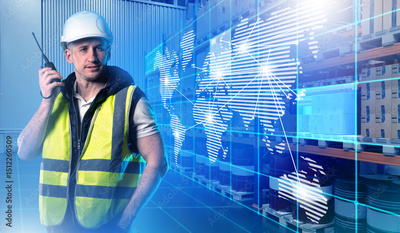 Warehouse worker with a radio in a smart logistics hub featuring a digital world map overlay, representing global supply chain connectivity and coordination.