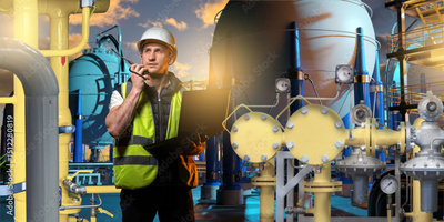 Engineer with laptop and radio inspects gas refinery equipment at night, surrounded by pipelines, valves, and storage tanks. Activity: Oil and gas industry, refinery inspection.