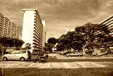 Low angle view of public housing HDB resident buildings/ flats complex with uncovered parking lot, grass courtyard, trees and dense of apartments at early morning in Singapore. Urban concept.
