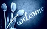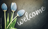 welcome greeting card top view of pastel blue tulips on dark gray slate blackboard background