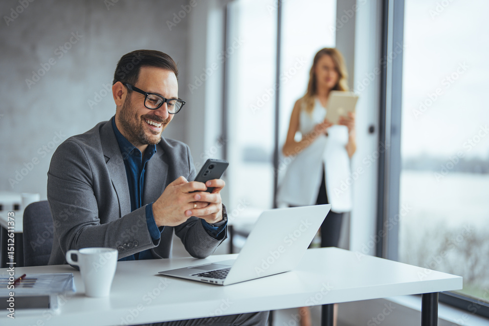 Smiling Businessman Using Smartphone While Working on Laptop in Modern Office