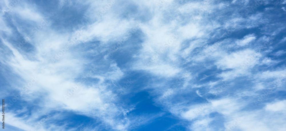 Blue sky with Wispy cirrus clouds, horizontal banner Abstract background. website headers, advertising layouts, ecological or environmental presentation