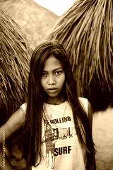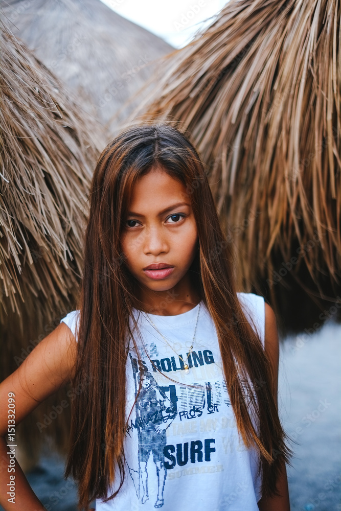 Portrait of a beautiful native Asian girl with the sunshade umbrella in the background