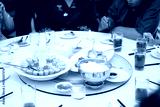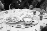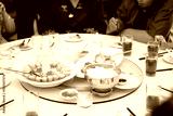 A serving of heavy Chinese food in the form of roulade and rice and other side dishes with a glass of drink such as tea and water on a round table for guests at an event at a restaurant