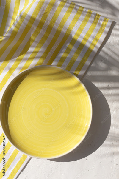 Empty ceramic yellow plate on the white plaster background with yellow striped pattern napkin or towel with tropical palm leaves shadows. Summer table setting. Copy space