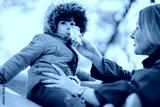 A heartwarming scene of a mother taking care of her child, dressed in cozy winter clothing, in an outdoor setting.
