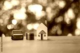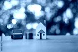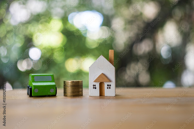 Miniature home and green car model and coins on wooden table. Finance and car loan, saving money for home and car concepts.