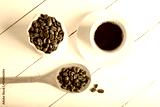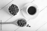 Cup of coffee, coffee beans in the bag, wooden spoon on a wooden white background table. Top view. Place for text or inscription.de view. Place for text or inscription.