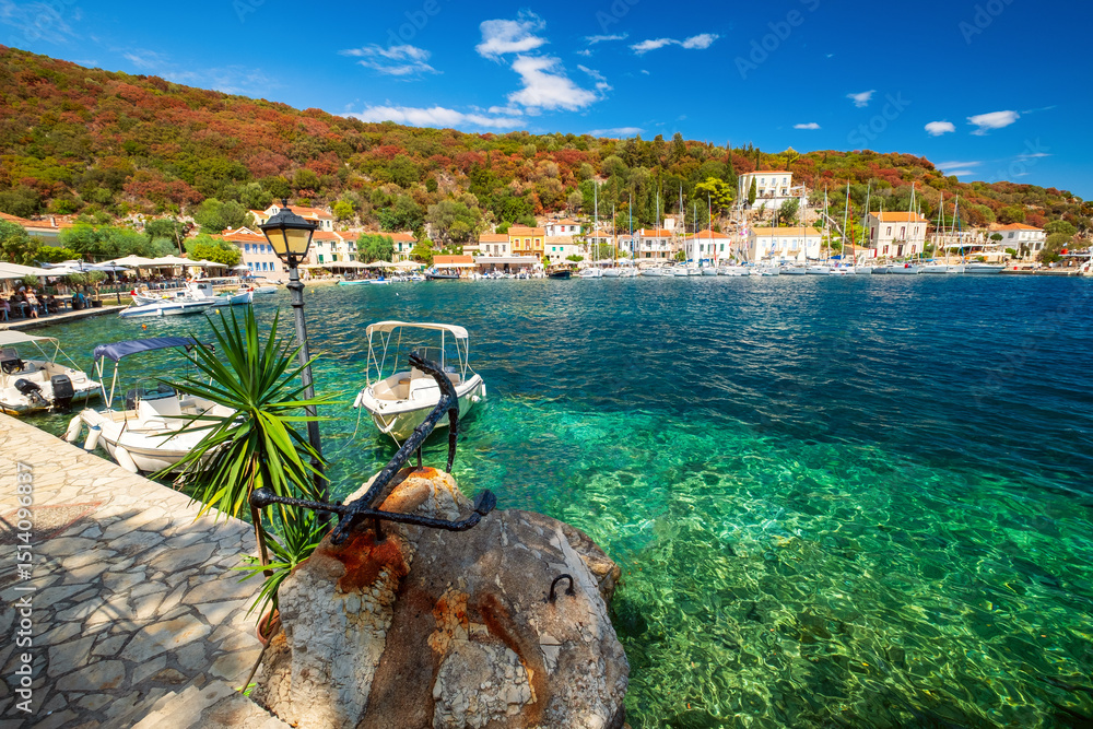 Cozy fishing village of Kioni on the island of Ithaca, with boats moored in the Ionian Sea near Kefalonia