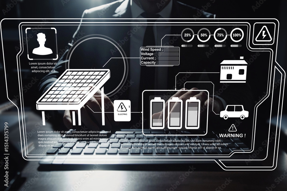 Professional Businessman Analyzing Solar Panel Data on Laptop with Digital Interface Representing Energy Management in Modern Office Environment