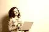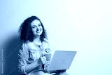 Beautiful young woman using laptop on light wall background