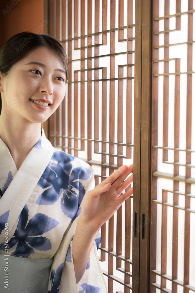 和室の廊下にいる浴衣の女性 襖に寄りかかる
