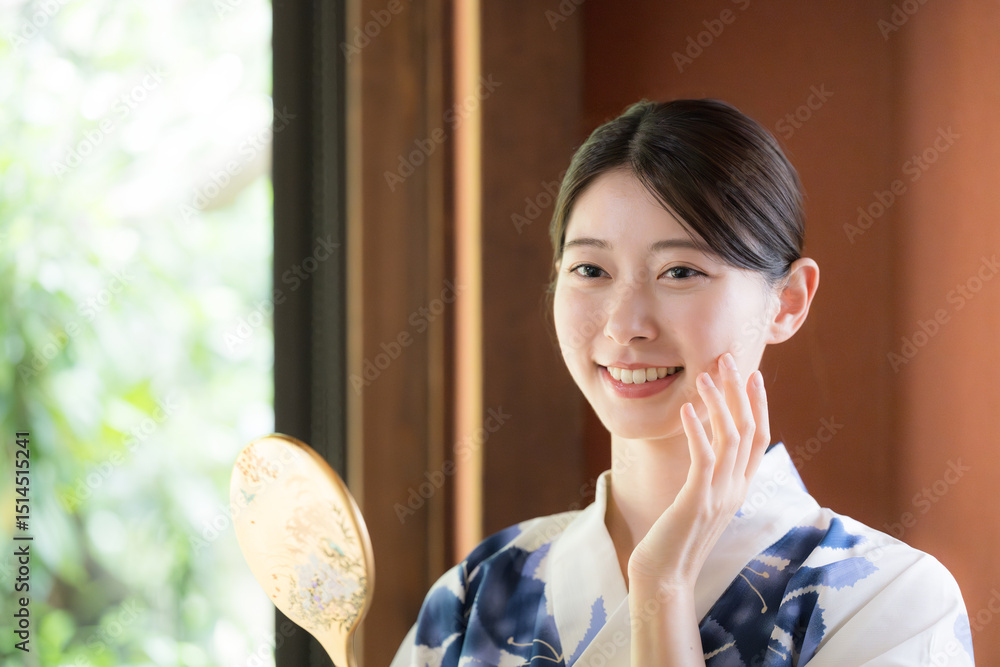 Woman in yukata checking her skin in the mirror Beauty and beauty image of kimono