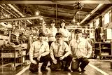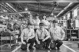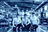 工場の中に並ぶ作業員グループの集合写真