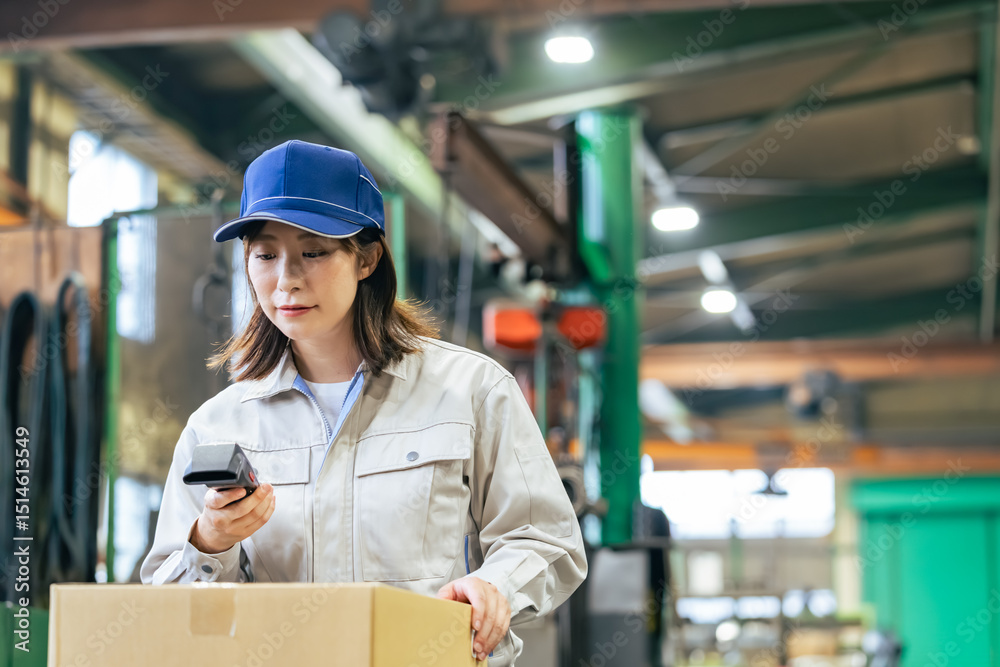 工場でハンディターミナルを使って商品を管理する女性作業員グループ