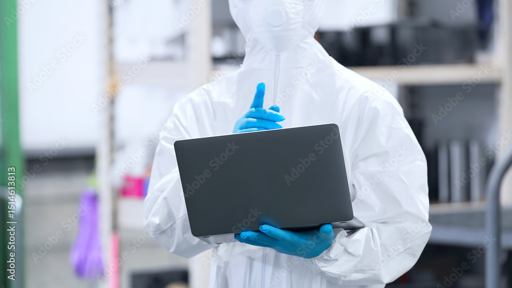 工場でノートPCを使う防護服を着た作業員