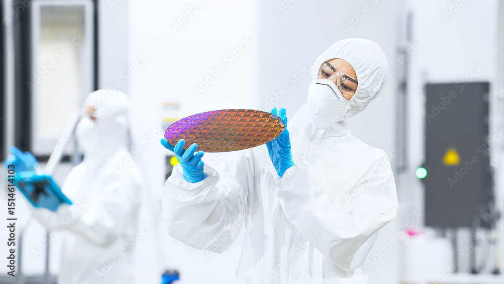 半導体工場でシリコンウエハーを検査する防護服を着た女性作業員