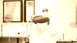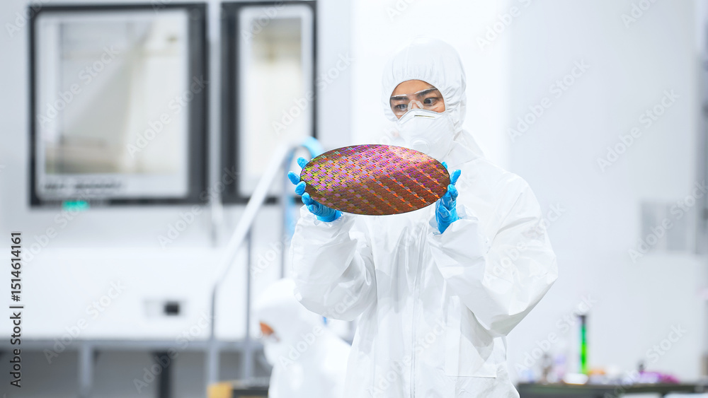 半導体工場でシリコンウエハーを検査する防護服を着た女性作業員