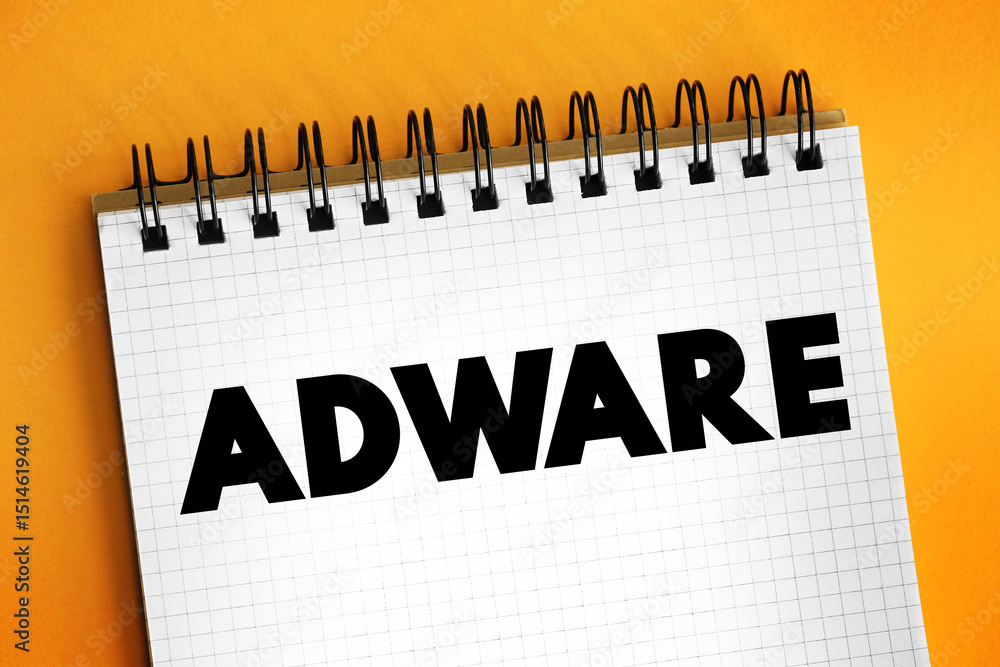 Adware - unwanted software designed to throw advertisements up on your screen, text concept on notepad